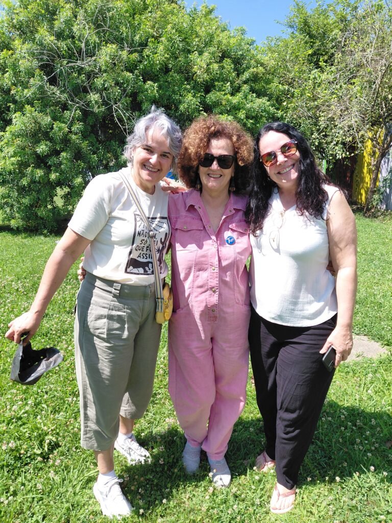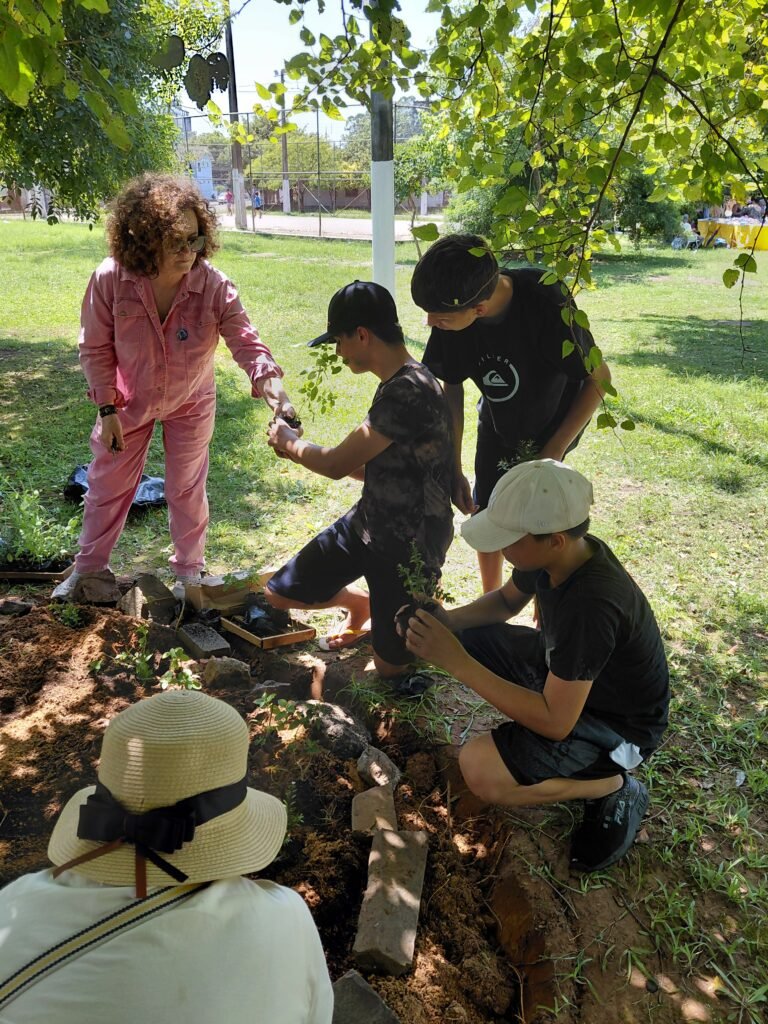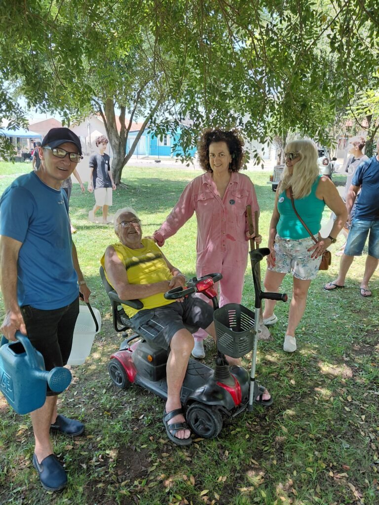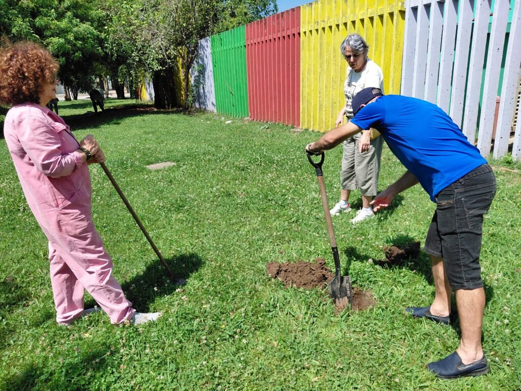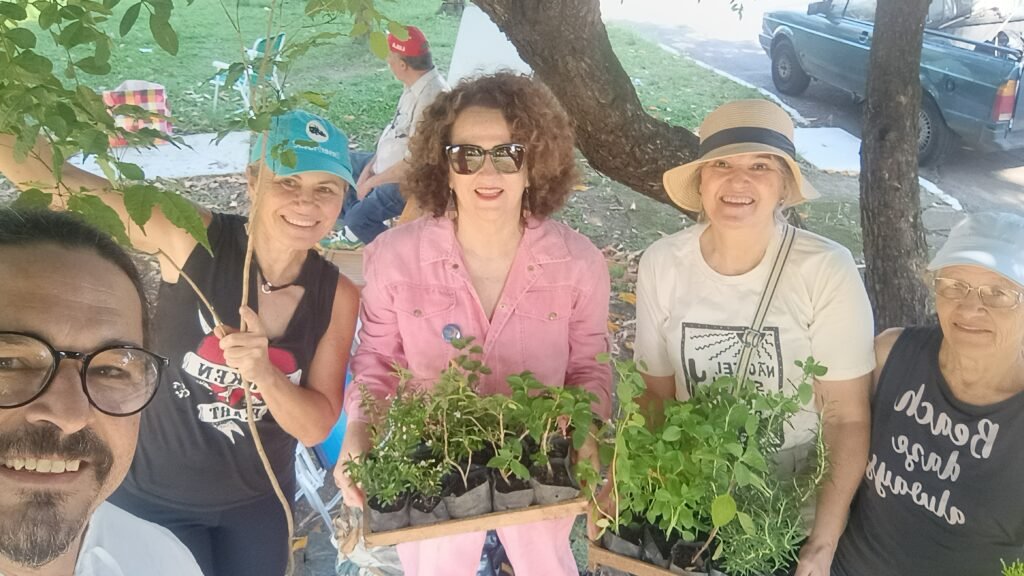 O plantio foi uma das atividades centrais da feira, que ocorreu na praça ao lado da Escola Irmã Sibila. Esta ação de base comunitária buscou promover o espírito de resiliência e contribuir para a recuperação material, estrutural e emocional das pessoas afetadas pelas inundações.