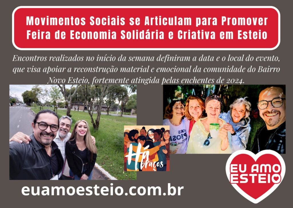 Encontros realizados no início da semana definiram a data e o local do evento, que visa apoiar a reconstrução material e emocional da comunidade do Bairro Novo Esteio, fortemente atingida pelas enchentes de 2024. Esteio, RS – O Coletivo Há Braços e parceiros do movimento social realizaram uma série de encontros nesta semana para organizar … Continue lendo Movimentos Sociais se Articulam para Promover Feira de Economia Solidária e Criativa em Esteio
