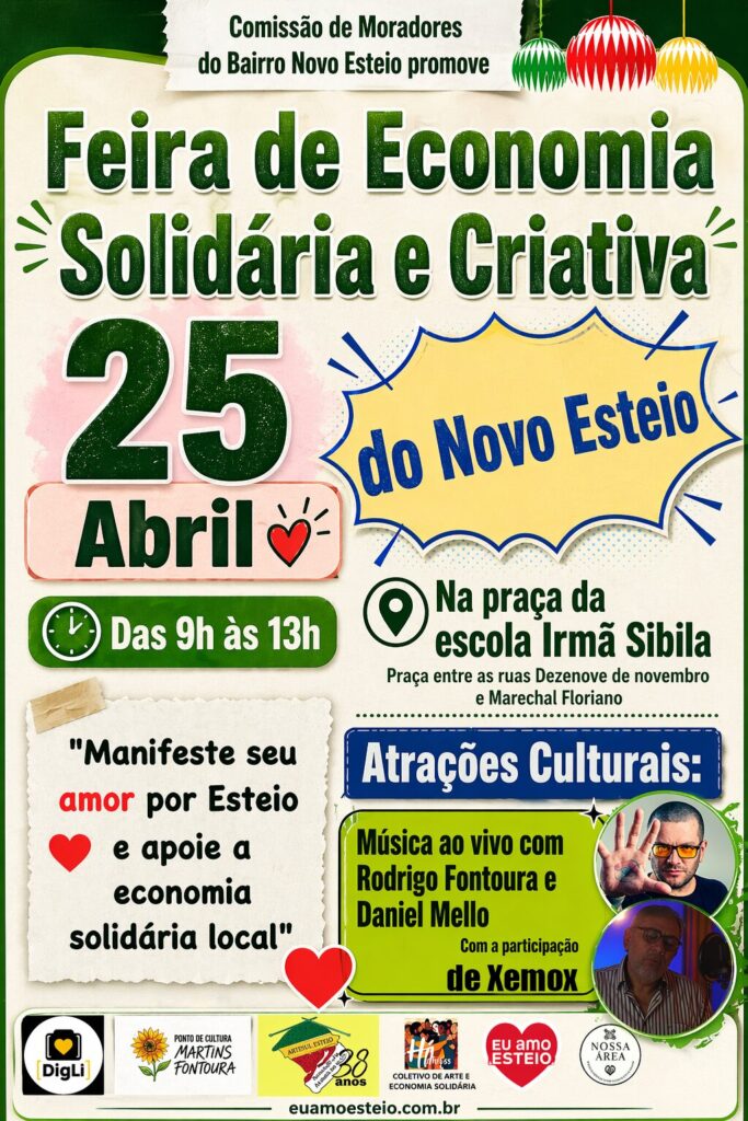 A Comissão de Moradores do Bairro Novo Esteio, em parceria com o movimento Nossa Área – Movimento Pela Economia Solidária, promove no próximo dia 25 de abril uma nova edição da Feira de Economia Solidária e Criativa. O evento ocorrerá das 9h às 13h, na praça localizada ao lado da Escola Irmã Sibila, contando com o apoio fundamental da Artesul (Associação dos Artesãos de Esteio) e do coletivo Há Braços. Esta atividade busca fortalecer a organização social, política e econômica da comunidade local, servindo como um espaço de encontro e fomento ao interesse comum.