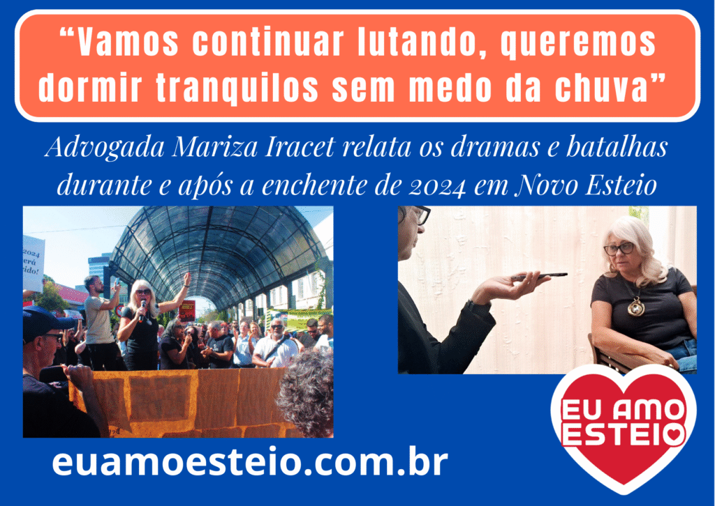 Advogada Mariza Iracet relata os dramas e batalhas durante e após a enchente de 2024 em Novo Esteio O site Eu amo Esteio conversou com a advogada e liderança comunitária do bairro Novo Esteio Mariza Aparecida Chuma Iracet, de 63 anos, sobre os efeitos da enchente de 24 na região. Ela, que mora há 25 … Continue lendo “Vamos continuar lutando, queremos dormir tranquilos sem medo da chuva”