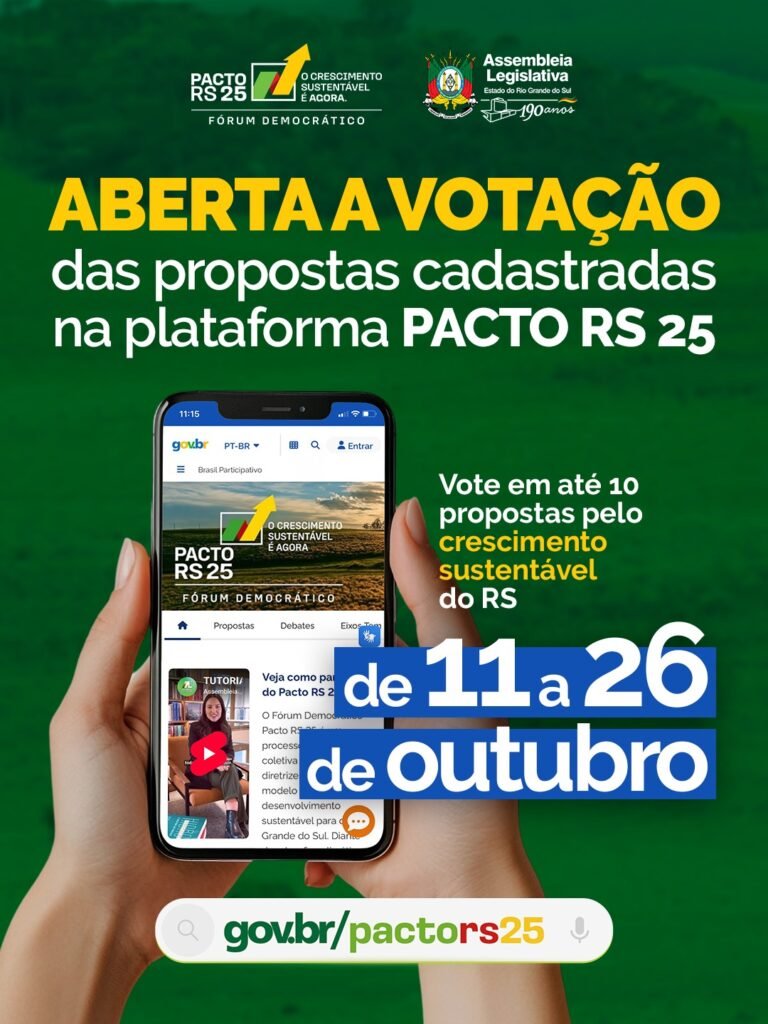 Destino das Propostas: As propostas mais votadas (as 80 mais votadas) serão destacadas e farão parte do documento final do Pacto RS 25. Este relatório final será apresentado no Seminário Final (previsto para novembro e dezembro) e, posteriormente, será encaminhado aos governos (estadual e federal) e ao Parlamento gaúcho para serem transformadas em políticas públicas e diretrizes de desenvolvimento.